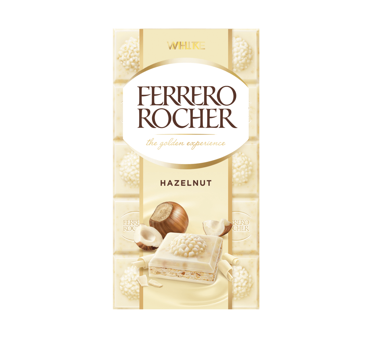 Created for all lovers of white chocolate to enjoy an irresistible harmony of textures and flavors. A velvety feeling of soft filling with crunchy hazelnut grains, gently wrapped in exquisite white chocolate.Discard the new Ferrero Rocher White and Hazelnut tablet to discover its unique shape and start your journey in pleasure.
