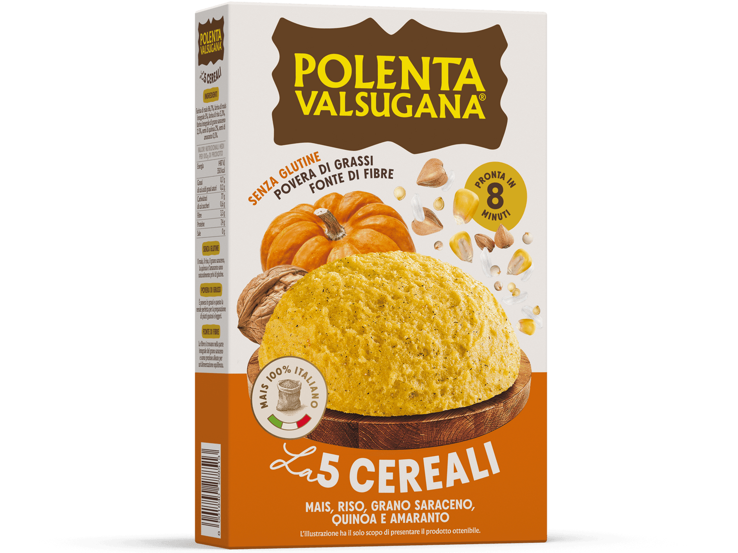 Polenta Valsugana with 5 Cereals contains corn, rice, buckwheat, quinoa and amaranth. It is the Polenta Valsugana ideal for those who are attentive to a balanced diet, rich in fiber and low in fat.