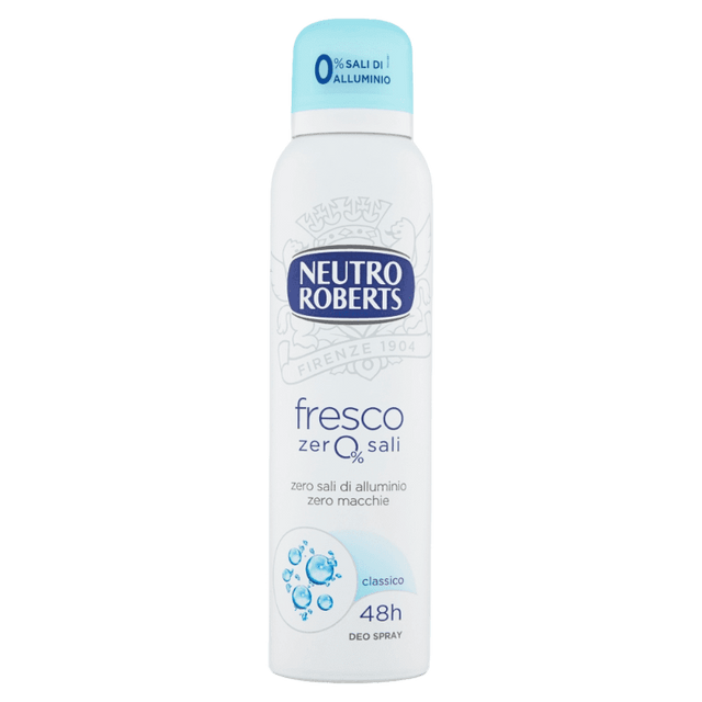 Neutro Roberts, deodorante spray fresco classico blu, zero sali, con puro olio di glicerina, 48h di profumo, 150ml.