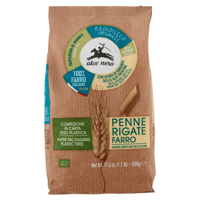 Organic spelt pens Alce Nero are obtained using only organic spelt of the variety Triticum Dicoccum cultivated in Italy. The rough surface makes them particularly suitable for absorbing condiments, ensuring quality and taste to each preparation.