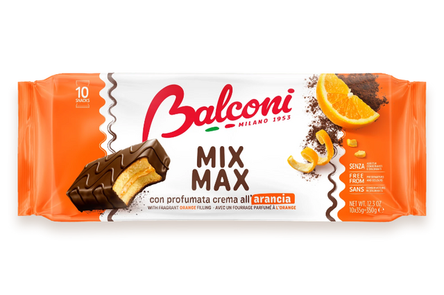 Balconi , colazione merendine, linea mixmax, mix max con golosa profumata crema all'arancia, pan di spagna ricoperto di cioccolato e farcito con crema all'arancia, 10 snack, 350gr.