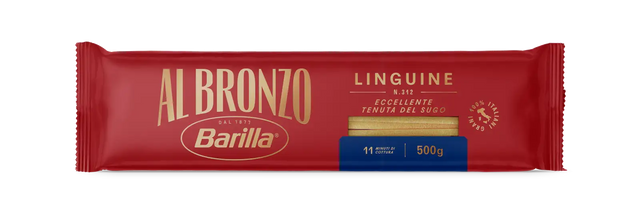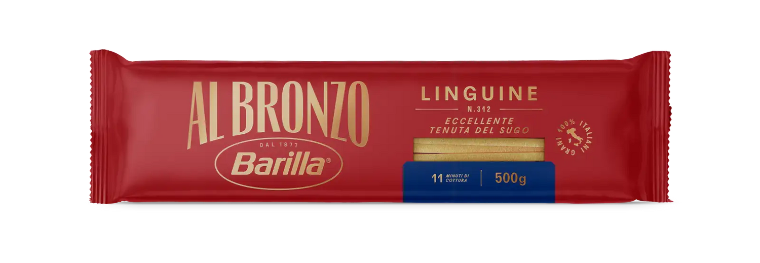Our Linguine Al Bronzo Barilla, have been designed with a thickness that makes the format full-bodied and consistent. The special bronze drawing, thanks to the raw processing method, gives the paste an intense roughness that makes it irresistible to the eyes and palate. Linguine Al Bronzo goes perfectly with any seasoning, for an extraordinary taste experience. Al Bronzo recreates the Raw Processing, drawing from the traditional method of bronze drawing: the dough is extruded through bronze dies with inserts enriched with micro-engravings that give the dough an intense roughness.