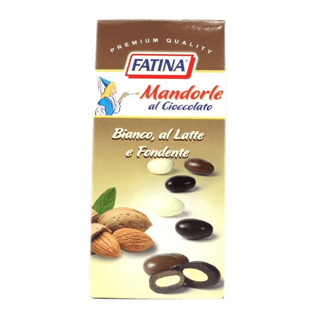 Fatina, premium quality, frutta secca e cioccolato, le mandorle ricoperte di cioccolato bianco, al latte e fondente ,160gr.