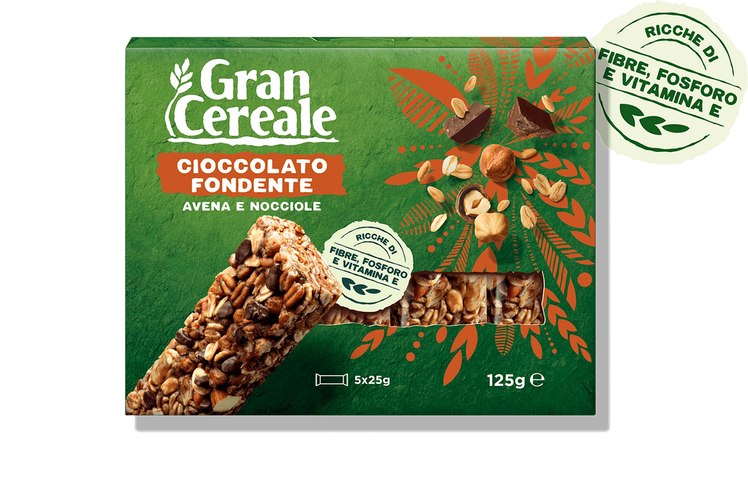 Gran Cereale, barrette di frutta secca, avena e nocciole, al gusto cioccolato fondente, 5 snack of 25gr, 125gr.