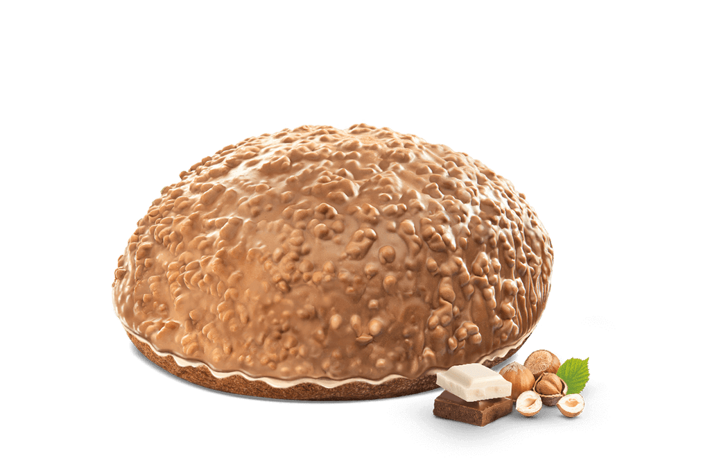 Wheat flour, Hazelnut cream 12% [sugar, glucose syrup, water, skimmed milk powder, butter (milk), hazelnut paste 3% (0.4% on the finished product), flavorings, stabilizer: pectins, preservative: potassium sorbate], Fresh eggs, Sugar, Milk chocolate 9% (sugar, cocoa butter, skimmed milk powder, cocoa paste, whey powder, milk fat, emulsifier: soy lecithin, aroma) White chocolate 9% (sugar, cocoa butter, whole milk powder, skimmed milk powder, emulsifier: soy lecithin, natural vanilla flavour), vegetable oils and fats (palm), natural sourdough 4% (wheat flour, water, yeast), Emulsifier: mono- and diglycerides of fatty acids of vegetable origin Hazelnut grains praline 3% [hazelnuts 50% (1.5% on the finished product), sugar, glucose-fructose syrup], glucose-fructose syrup, skimmed milk powder, salt, flavourings. May contain: cereals containing gluten, nuts and mustard.
