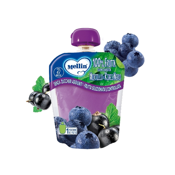 Mellin, merenda di frutta, succo di frutta per bambini al gusto mirtillo e ribes nero, 100% frutta con carota, 90gr.
