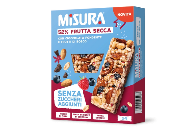 Misura dolcesenza, barrette energetiche di 52% frutta secca ,senza zuccheri aggiunti,e con cioccolato fondete e frutti di bosco, snack bars sugar free made with dark chocolate and ,4 units of 30g.