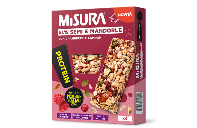 Misura protein, barrette energetiche di 51% frutta secca semi e mandorle, ad alto contenuto di fibre,e con cranberry e lamponi, snack bars protein made with cranberry and raspberries ,4 units of 30g.