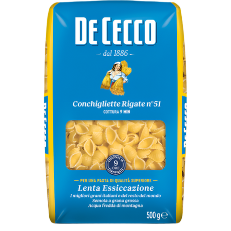 £2754£3382Unit price /UnavailableDE CECCO PASTA DI SEMOLA CONCHIGLIETTE RIGATE N.51 500 GR (24 in a box)
