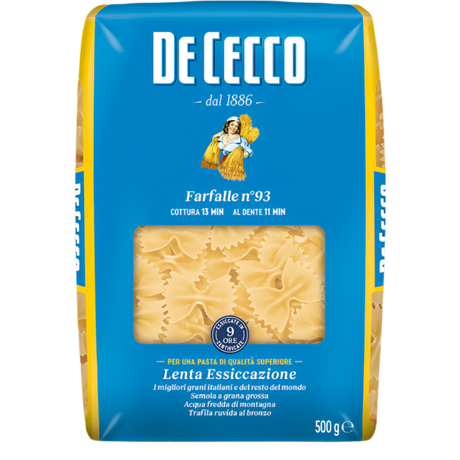 £2754£3382Unit price /UnavailableDE CECCO PASTA DI SEMOLA FARFALLE N.93 500 GR (24 in a box)