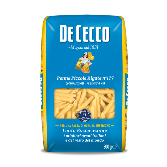 De cecco pasta di semola lenta essiccazione penne piccole rigate n.177 , 500gr.
