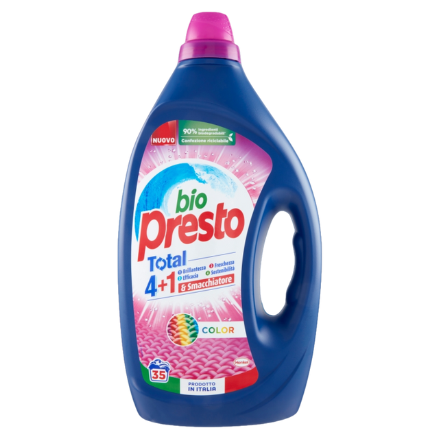 Bio Presto, detergente liquido per lavatrice, ideale per i capi colorati, adatto a smacchiare tutti i tipi di macchie, circa 35 lavaggi a basse temperature, 1750ml.