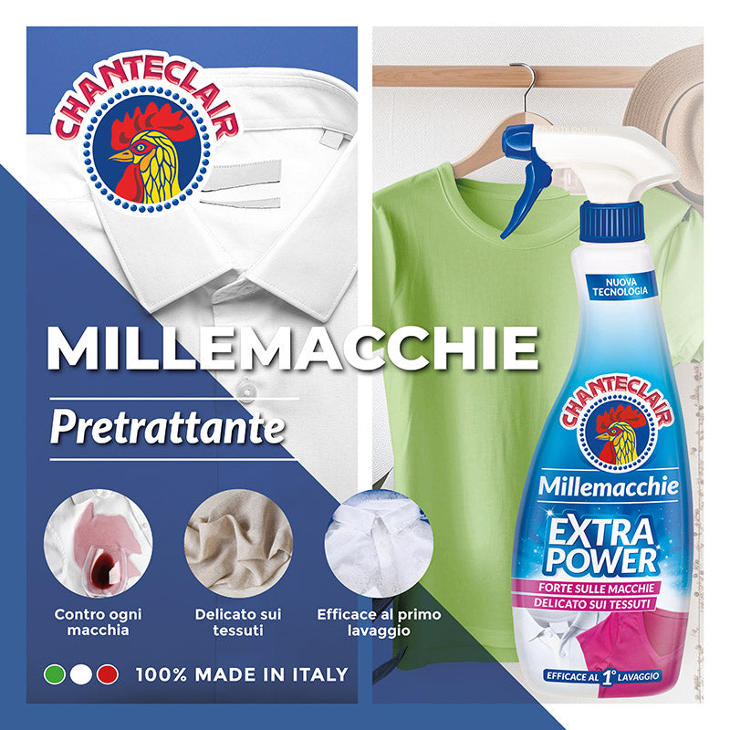 Chanteclair pretrattante per bucato, millemacchie extra power, forte su tutti i tipi di macchie e sporco, delicato sui tessuti ,500ml.