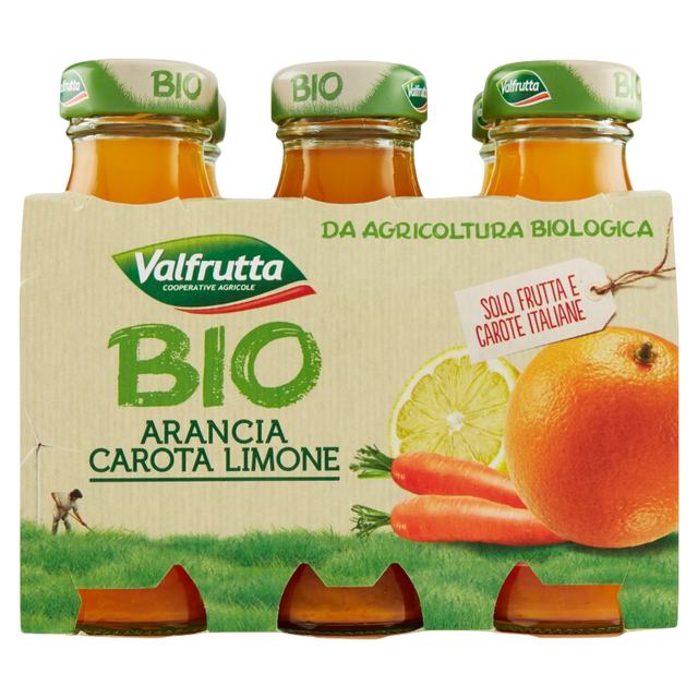 Valfrutta organic, succo di frutta biologico , gusto arancia,carote e limoni, italiani, 6 bottiglie di vetro, 12,5cl.