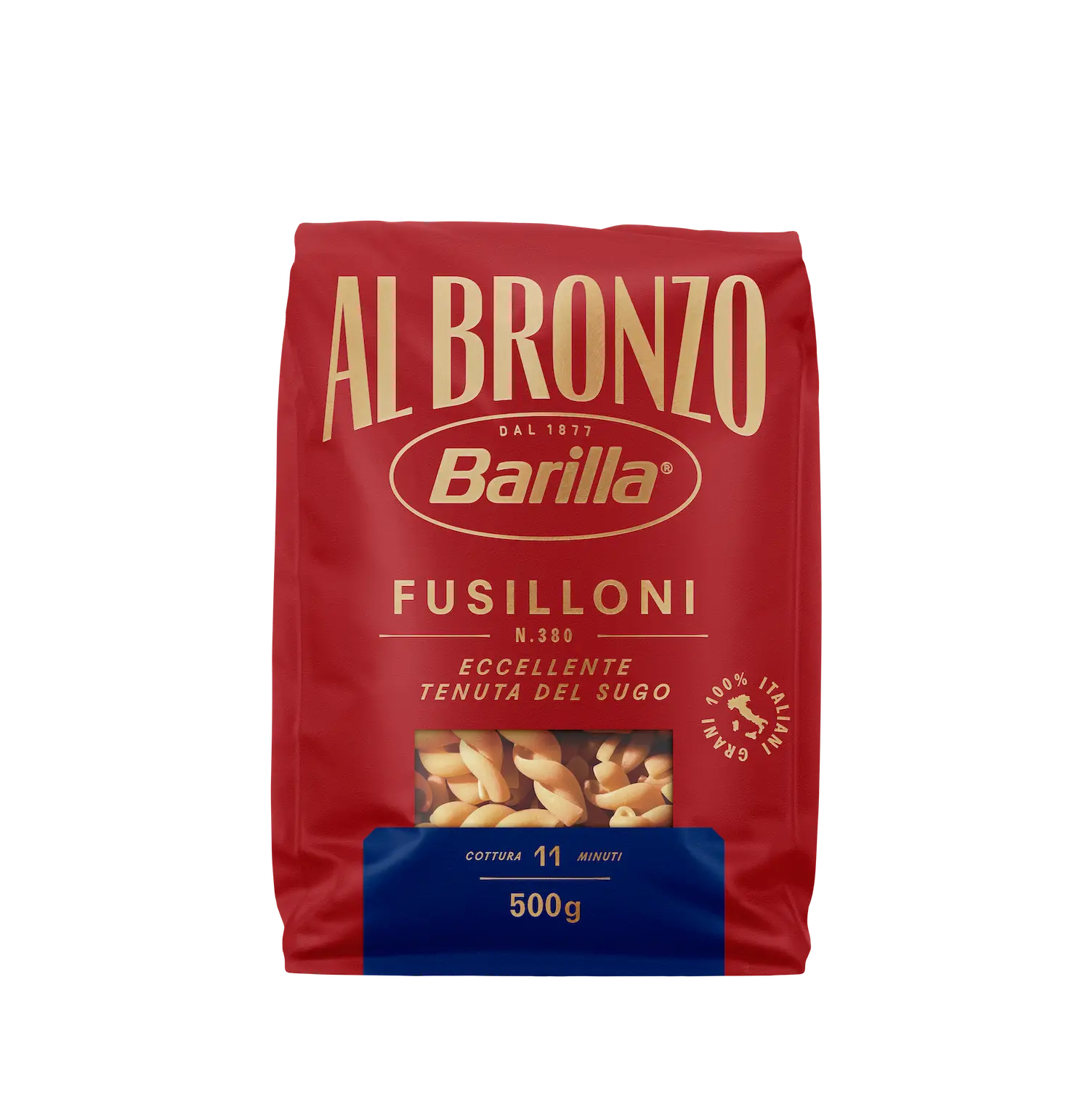 The curves and propellers of our Barilla Bronze Fusilloni, combined with the full-bodied texture, create a perfect balance for an extraordinary taste experience. The intense roughness, thanks to the rough bronze working method, and the enveloping shape make the Fusilloni Al Bronzo Barilla ideal to taste with any seasoning.