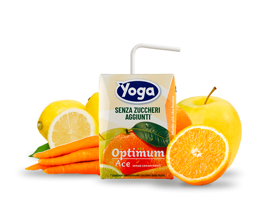 Optimum Yoga without added sugars ACE contains 90% fruit, such as oranges, carrots and lemons harvested at the right degree of ripeness. It is the good and tasty juice, source of essential fiber for the body and rich in vitamins C and E naturally present. A pleasant and light mix to drink at any time of the day, prepared with experience and passion for the most chosen Yoga juices by mothers and drunk by children.